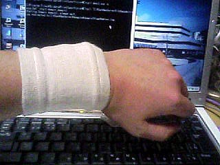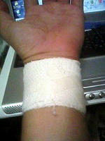 「サポーターを忘れて…とりあえず外来でサポーターもどきをもらったので…テープでぐるぐる巻きにして手首を固めてみたました」